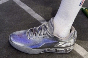 今日NBA全明星正赛日,勇士球星斯蒂芬· 库里穿着安踏KT11银色限定版亮相。