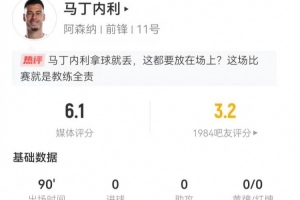 体育资讯2月19日讯 阿森纳在本轮英超2-2被狼队绝平,马丁内利本场数据如下:
