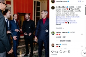 贝克汉姆写道:“永远的米兰。自2009年以来首次重聚……非常美好的夜晚,受Eyewear by David Beckham的邀请,在米兰城见到了我在米兰时期的老队友们。”
