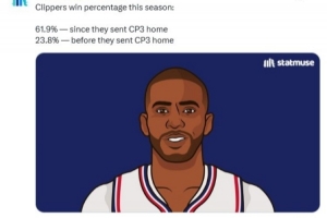 转折点?美媒晒数据:快船送走保罗前胜率23.8% 之后61.9%