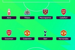 中场:道曼(阿森纳)、卡塞米罗(曼联)、萨尔(热刺)、B费(曼联)