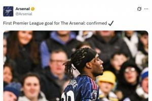 阿森纳官方向马杜埃凯祝贺道:“代表阿森纳的首粒英超进球:已确认✔️”。