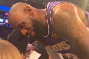 在这段花絮中,詹姆斯在赛前笑容满面地俯身亲吻了妻子萨瓦娜,并称呼妻子为“宝贝”。