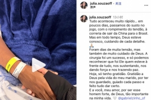 一切来得太突然…这几天从比赛中的惊魂一幕,到肌腱断裂,再到返回巴西接受治疗,尽管匆忙,但上帝一直与我们同在。手术很成功,希望上帝守护我们,给我们力量,保我们平安。