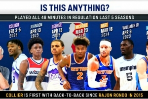 过去5个赛季打满48分钟的球员:奇才约翰逊和爵士基昂特·乔治在2025年4月13日打满;尼克斯麦克布莱德在2024年3月23日打满;尼克斯哈特在2024年3月18日打满;灰熊文斯·威廉姆斯在2023年4月9日;雷霆卡莱察基斯2022年4月10日打满。
